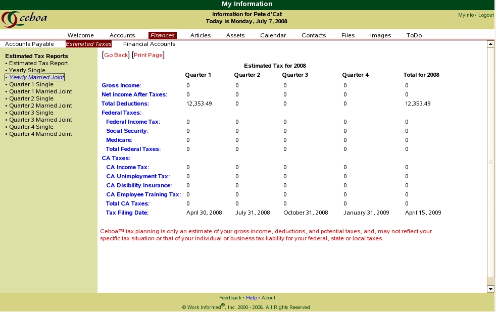 Ceboa provides you a quick way to get a snap shot and estimation of your federal and state taxes. Using Ceboa's invoicing and accounts payable features, the tax estimation facility collects your income and deductions and provides a quarterly and yearly tax estimate.