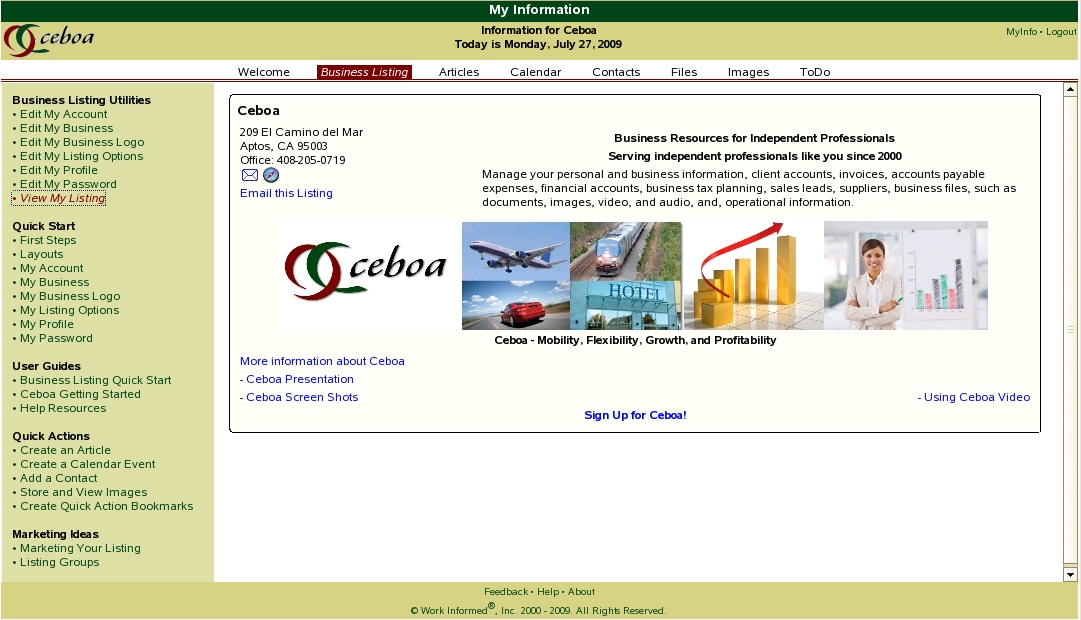 Ceboa's business listing content management facilities make it simple to create and manage your listing advertisement layout. Ceboa's Business Listing is tailored for the needs of small businesses and independent professionals and gives you a simple and effective way to attract new customers, build your web presence, and achieve a higher likelihood of being found by search engines. The Business Listing tab focuses on presenting quick business listing editing facilities.