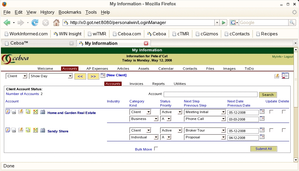 Ceboa's Account Manager is an easy way to manage client information and expenses for billing purposes. The Account Manager is tailored for the needs of independent business professionals and gives you the ability to maintain control over your office and practice from any location with any web enabled device. The Account Manager focuses on presenting quick access to client information and enables you to easily document actions that you perform in support of your clients. Status and information fields allow you to prioritize your clients, identify next step actions, and establish reference criteria and account identifications based on your operational practice needs and preferences.