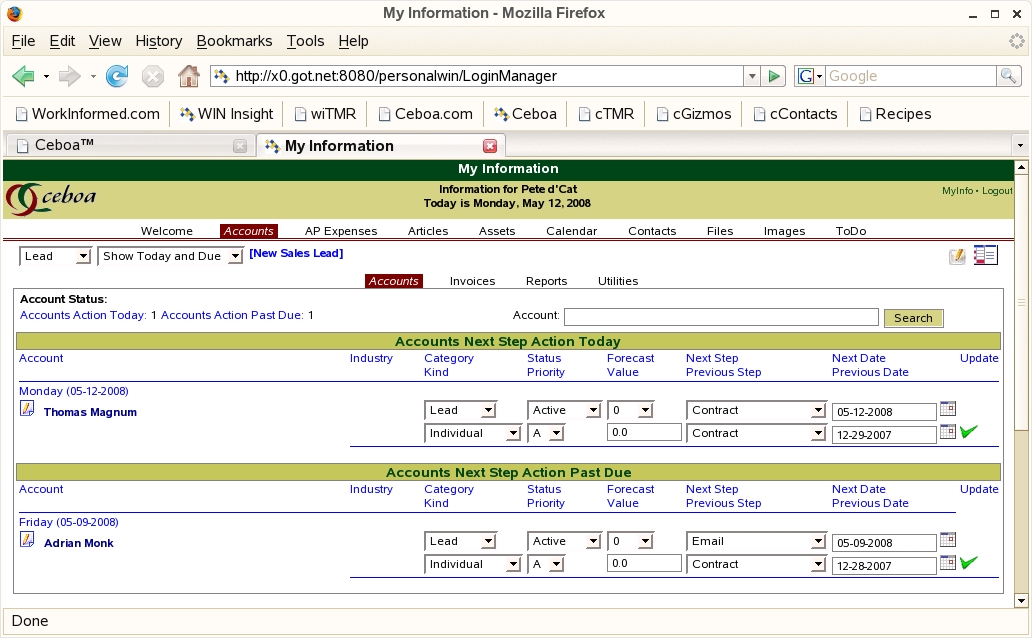 Ceboa gives you an easy way to manage your sales leads and your sales process. As part of the Account Manager, you can create your sales leads and manage the process of identifying and acquiring your customers, and, you have the ability to easily track your leads and sales actions. This sales lead management facility is tailored for your needs as an independent business professional whether your fundamental business service is sales itself or some other service that requires you to manage the acquisition of your customers. The Sales Lead Manager focuses on presenting quick access to lead information and enables you to easily view sales activities associated with acquiring your customer. Status and information fields allow you to prioritize your leads, identify next step actions, establish an acquisition forecast, and identify customer industries based on your operational practice needs and preferences.