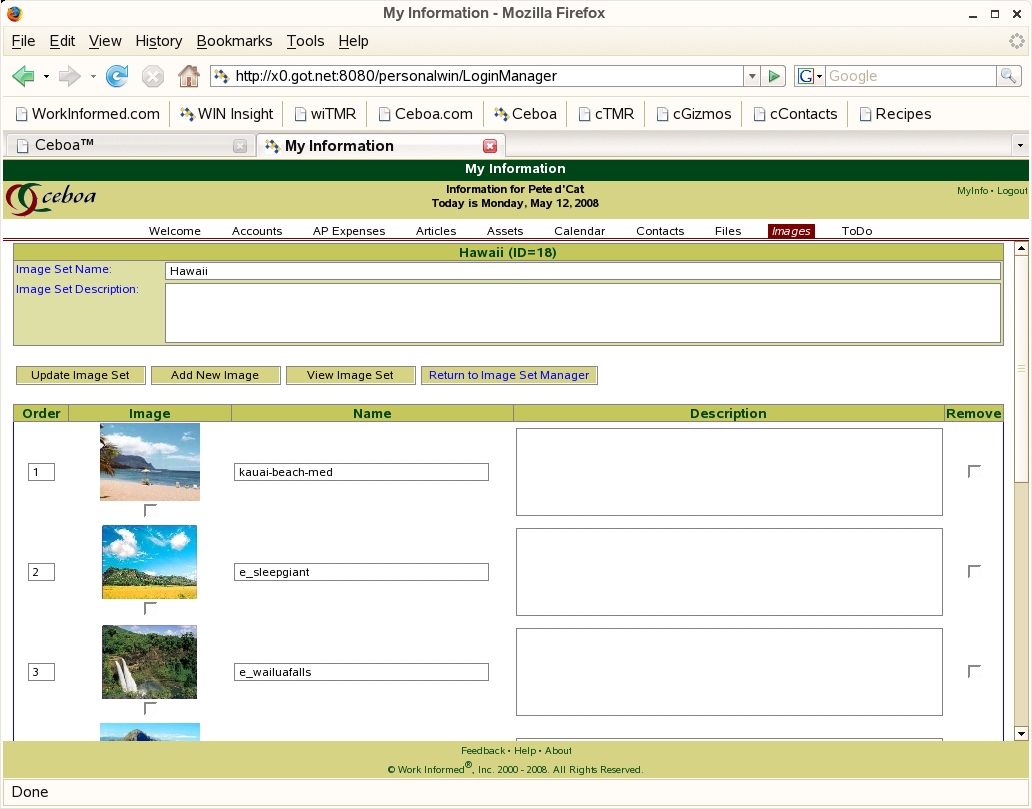 Ceboa's Image Manager is an easy way to store photos and images. The Image Manager gives you the flexibility to gain access to and use your images independent of a specific PC, network, or location. Images stored in the Image Manager can be referenced embedded in an article so that you can easily display, access, and use your stored photos and images. An example of the Photo Viewer is the "Photos and Viewers" example in the right sidebar.