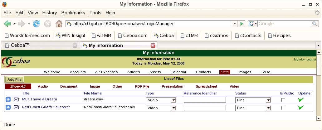 Ceboa's flexible File Library is a fast and easy way to store documents, files, images, audio, and video. The File Library gives you the flexibility to gain access to and use your files independent of a specific PC, network, or location. This frees you from the need to lug around your laptop simply to access your files. Files stored in the File Library can be referenced either via the File Library or by placing the file in an article so that you can use an article to easily display, access, and use your stored files. An example of this is the "Access Your Files" example in the right sidebar.