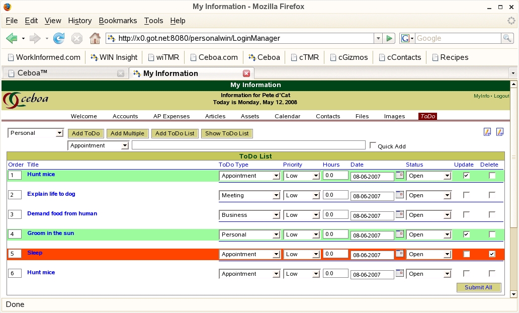 Ceboa's ToDo List feature gives you a quick and simple way to categorize and manage your ToDo Lists. Most importantly, your activities are virtually with you no matter where you are. Now, there's no need to lug around a clunky binder or be tied to a specific PC or your laptop.